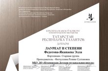 Поздравляем победителей II Республиканского конкурса исполнительского мастерства "Татарстан. Республика талантов", прошедшего в г.Казань. Учащиеся фортепианного отделения Федотова-Яканаева Элла удостоилась звания Лауреата 2 степени, Федорова Ариана - Лауреата 3 степени (преподаватель Фатхуллина Р.С.)!