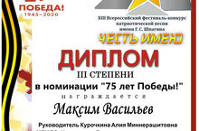 Стали известны результаты ХIII Всероссийского фестиваля-конкурса патриотической песни «Честь имею» им. Г. С. Шпагина. Учащиеся нашей школы Васильев Максим удостоился звания Дипломанта 3 степени. Поздравляем Максима и преподавателя Курочкину Алию Миннерашитовну!