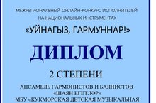 Учащиеся Кукморской детской музыкальной школы приняли участие в Межрегиональном онлайн-конкурсеисполнителей на национальных народных инструментах "Уйнагыз гармуннар", прошедшего в с.Аракаево Свердловской области. Ансамбль гармонистов и баянистов "Шаян егетлэр" под руководством преподавателя Рафикова Д.Ф. Награжден Дипломом 2 степени и ансамбль кураистов "Тургай" под руководством преподавателя Гузаерова Т.Р. - Дипломом 3 степени! Поздравляем!!!