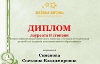 Поздравляем преподавателя Семенову Светлану Владимировну с победой на Всероссийском педагогическом конкурсе "Лучшая методическая разработка педагога дополнительного образования". В номинации «Конспект урока (учебного занятия)» с конкурсной работой: «Сказочные сюжеты в музыке. Образ Бабы Яги в произведениях русских композиторов XIX века М.П. Мусоргского, П.И. Чайковского, А.К. Лядова» удостоилась звания Лауреата 2 степени!
