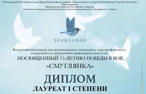 Стали известны результаты Всероссийского инструментального, вокального, хореографического, театрального и декоративно-прикладного искусства, посвященного 75-летию Победы в ВОВ "СМУГЛЯНКА". Конкурс проводился в этос году дистанционно Региональным Благотворительным Общественным Фондом развития исполнительского искусства Республики Татарстан "Sforzando" при поддержке Министерства культуры Республики Татарстан. По результатам конкурса: