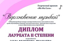 Поздравляем ученицу Федотову-Яканаеву Эллу и преподавателя Фатхуллину Р.С. с победой во II Международном конкурсе инструментального исполнительства "Вдохновение музыкой"!