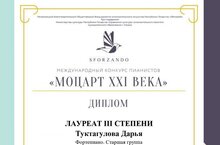 9 апрель көнне Казанда "XXI гасыр Моцарты" Халыкара пианистлар конкурсы узды. Конкурсны гамәлгә куючы - "Sforzando" ТР музыкаль башкаручысын үстерүнең төбәк хәйрия иҗтимагый фонды. Әлеге конкурс нәтиҗәләре буенча Семенова С.В .классы укычысы Туктагулова Дарья 3 нче дәрәҗә Лауреат булды! Котлыйбыз! -