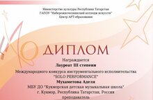 «SOLO PERFORMANCE» Халыкара башкаручы конкурсының нәтиҗәләре билгеле булды, ул Яр Чаллы сәнгать көллиятеендә узды. Конкурста Курочкина А.М. классы укучылары катнашты. «Фортепиано» номинациясендә Мөхәммәтова Аделя – 3-нче дәрәҗә Лауреат, Хаматдинова Илдана - дипломант исеменә лаек булдылар! Котлыйбыз!!! -