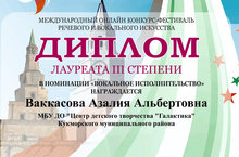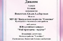 С целью развития творческой деятельности педагогических работников по обновлению содержания образования, а также выявления талантливых работников системы образования и создания социальных условий для профессионально-личностного роста педагогов прошел III Всероссийский конкурс «Моё призвание - педагог». Педагог Центра детского творчества «Галактика» Ваккасова Азалия Альбертовна приняла участие в конкурсе и стала Лауреатом 1 степени.
