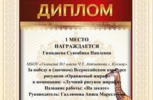 1 место - Ямалов Римхан Тахирович, мама Ямалова Земфира Ильдаровна, руководитель Гарифуллина Римма Гильмановна; «Многопрофильный лицей им.А.М.Булатова п.г.т.Кукмор»
