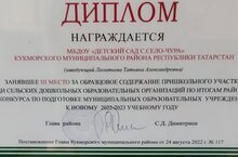 2022-2023 уку елына муниципаль белем бирү учреждениеләрен әзерләү буенча, мәктәп яны участогын үрнәк тотканы өчен 3 нче урынлы диплом белән Село-Чура авылы балалар бакчасы бүләкләнә. Котлыйбыз!