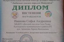 Воспитанница наша детского сада, Иванова Софья Андреевна, была награждена дипломом 3 степени в Межрегиональном заочном конкурсе детского творчества "Любимые сказки народов Поволжья" . Руководитель: Архипова Лариса Васильевна. Поздравляем!!!