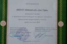 Грамотой награждается МБДОУ "Детский сад с.Село-Чура", занявший 3 место на муниципальном конкурсе на лучшее новогоднее оформление территорий зданий среди сельских ДОУ.