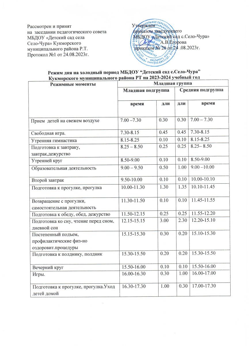Режим дня младшей,средней подгруппы на холодный период 2023-2024 учебный год