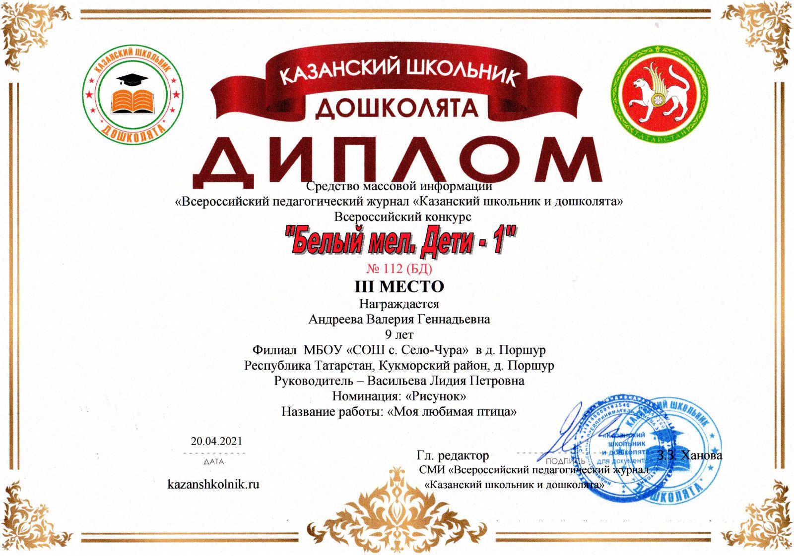 2в-3в сыйныфы укучылары Андреева Валерия, Владимирова Полина һәм Владимиров Константиннар “Ак акбур. Балалар”-1 Бөтенроссия конкурсында 3 нче урыннарны яуладылар һәм дипломнар белән бүләкләнделәр. Котлыйбыз!!!