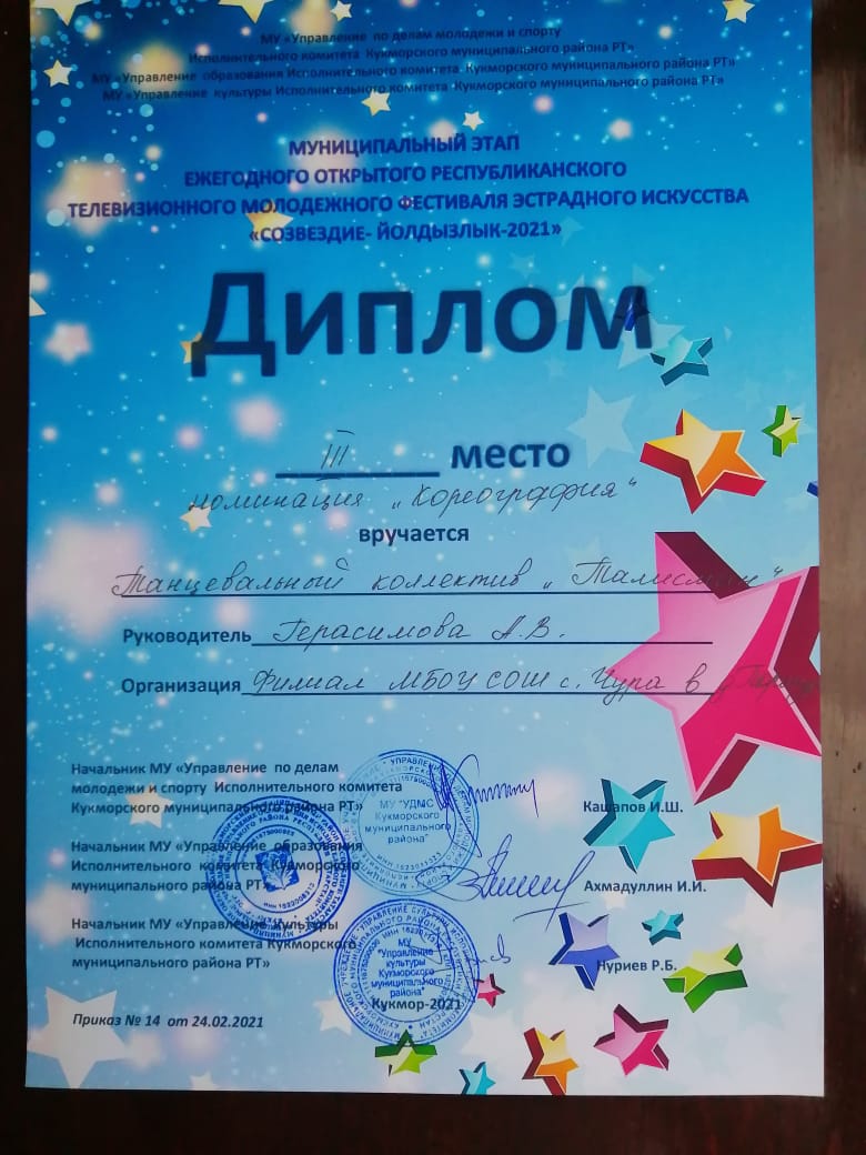 24 нче февраль көнне мәктәбебез укучылары "Созвездие-Йолдызлык-2021"фестиваленең муниципаль этабында "Вокал" hәм "Хореография" номинацияләрендә чыгыш ясадылар.