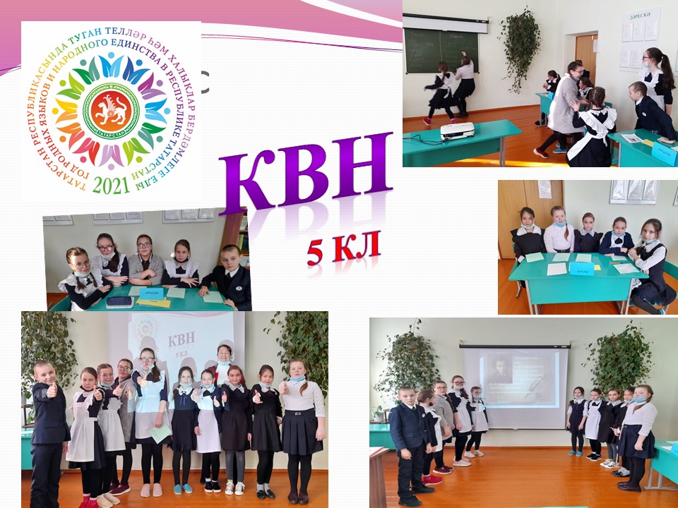 9 нчы февраль көнне 5 нче сыйныф укучылары очен рус теленнән КВН үткәрелде. “Туган телләр һәм халыклар бердәмлеге елы” уңаеннан бу уенда туган телгә багышланган шигырьләр сөйләнде, җырлар җырланды. Укучылар "Халыклар бердәмлеге" темасына карата рәсемнәр дә әзерләгәннәр иде. Уен укучылар өчен файдалы да, куңелле дә узды.