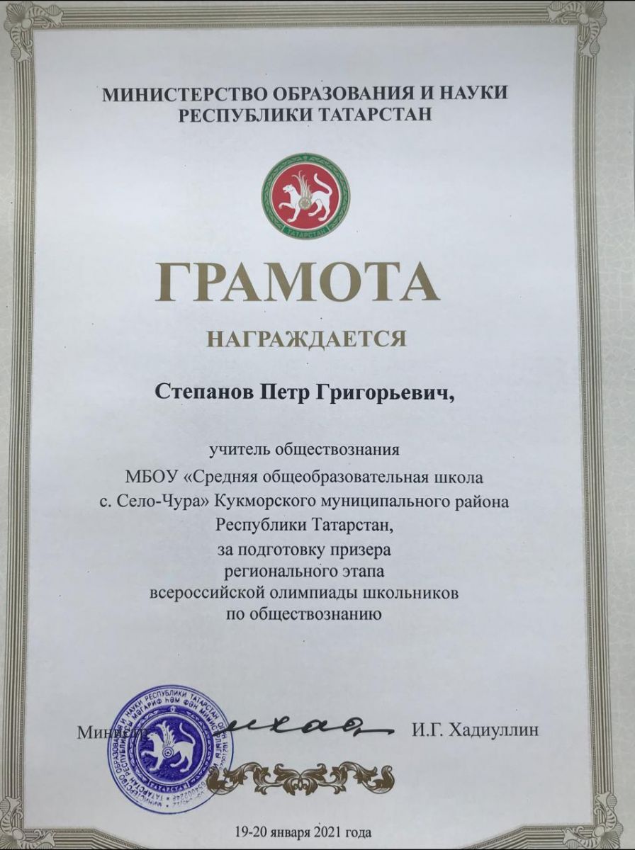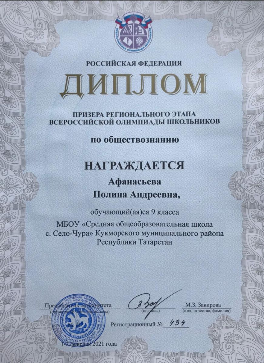 С 1 по 3 февраля 2021 года в г. Казани состоялся региональный этап Всероссийской олимпиады школьников по обществознанию. Олимпиада состояла из 2 туров. В 1 туре обучающиеся выполняли работу с текстом. В 2 туре выполняли тестовую работу. Учащаяся 9 класса нашей школы Афанасьева Полина Андреевна (учитель – Степанов П.Г.) стала призёром. Поздравляем её с достигнутыми успехами!!!