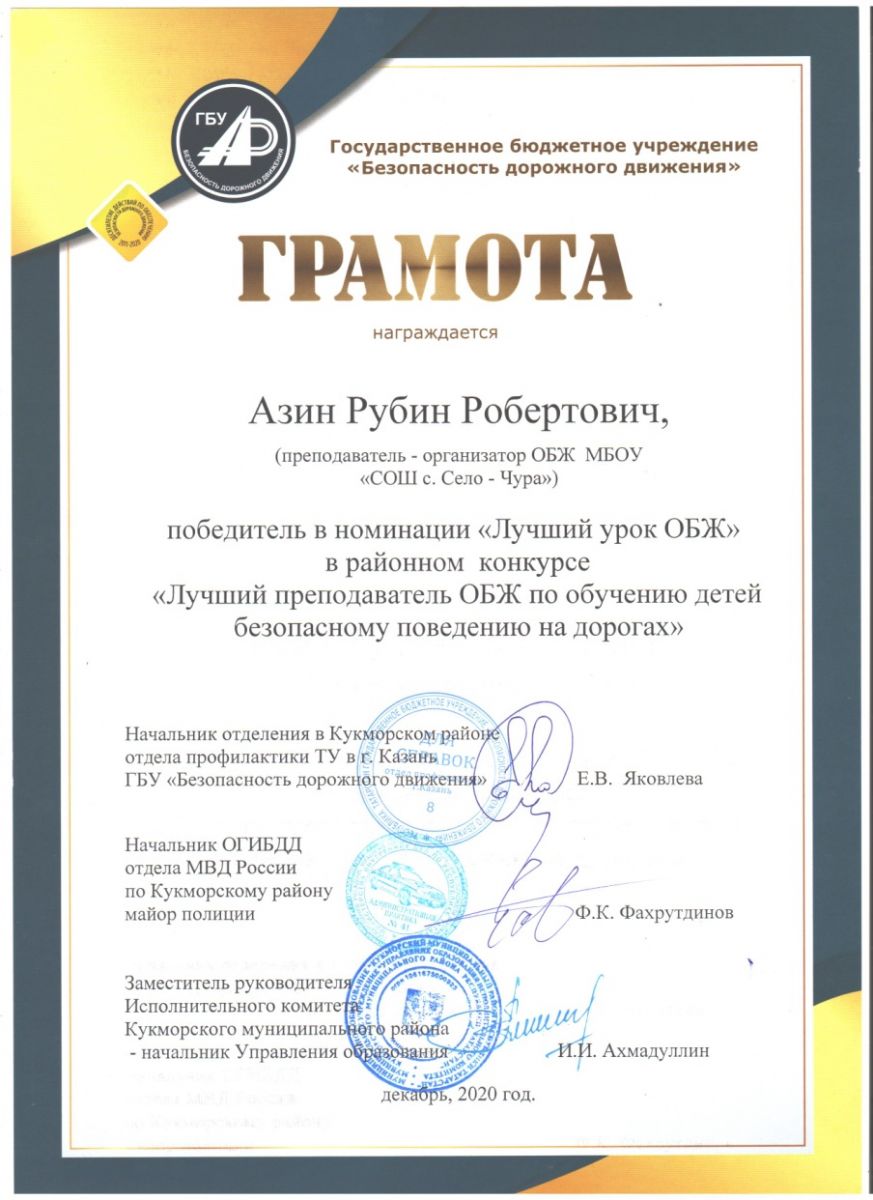 В Кукморе прошел районный конкурс «Лучший преподаватель ОБЖ по обучению детей безопасному поведению на дорогах». По итогам конкурса наш учитель ОБЖ Азин Рубин Робертович стал победителем в номинации «Лучший урок ОБЖ». Поздравляем его с победой! Желаем дальнейших успехов!