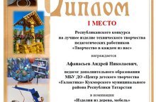 Подведены итоги республиканского конкурса на лучшее изделие технического творчества педагогических работников "Творчество в каждом из нас". Учитель физкультуры, педагог дополнительного образования ЦДТ "Галактика" Афанасьев А.Н. занял 1 место. Поздравляем! / "Иҗат безнең һәрберебездэ" дип исемләнгән республика конкурсының нәтиҗәләре билгеле булды. Физкультура укытучысы Афанасьев А.Н. эше 1 нче урынга лаек. Котлыйбыз!