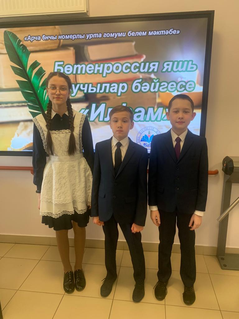 5 нче апрель көнне Арча шәһәренең 6 нчы мәктәбендә "Илһам" Бөтенроссия яшь язучылар бәйгесенең зона туры узды. Анда беренче турны уңышлы узган укучылар катнашты. Безнең мәктәптән Набиев Рүзәл, Мөхәммәтов Салих, Нәҗмиева Хәдичә, Гайнетдинова Камиләләр икенче турга уздылар һәм уңышлы гына чыгыш ясадылар. Уңай нәтиҗәләр көтәбез. Җитәкчеләр- Кадырова Энҗе Хәйдәр кызы, Низамова Гөлзадә Илсур кызы.