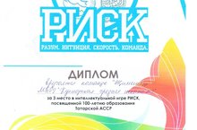 11 октября 2019 года, на базе МБУ ДО "ЦДТ "Галактика" Кукморского муниципального района РТ, прошёл муниципальный этап всероссийской интеллектуальной игры РИСК: разум, интуиция, скорость, команда! Команда нашей школы «Җимешләр» заняла III призовое место.
