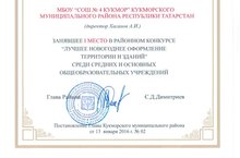Наша школа заняла 1 место в районном конкурсе «Лучшее новогоднее оформление территории и зданий» среди средних и основных общеобразовательных учреждений и награждена Почетной грамотой Главы Кукморского муниципального района.