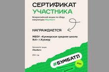 По итогам муниципального этапа Всероссийской акции по сбору макулатуры #БумБатл наша школа заняла 1 место, а за участие на Всероссийском этапе награждена сертификатом.