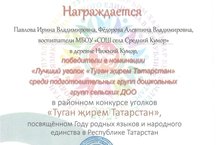 Педагоги дошкольных групп приняли активное участие в конкурсе уголков «Туган жирем Татарстан». Воспитатели Павлова И.В., Федорова А.В. стали победителями в номинации «Лучший уголок «Туган жирем Татарстан» среди подготовительных групп сельских ДОО, Ефремова М.В. заняла 2 место среди педагогов сельских ДОО.