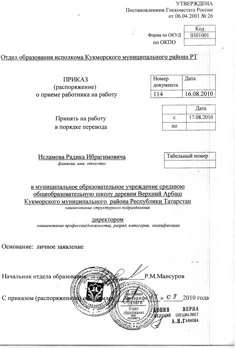 Приказ о назначении директора МБОУ "Верхне- Арбашская средняя школа"/Югары Арбаш урта мәктәбе директорын билгеләү турында боерык