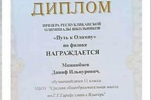 Мәктәбебезнең 11 нче сыйныф укучысы Миннибаев Дәниф "Путь к Олимпу" дип исемләнгән республика олимпиадасында физика фәненнән призер исеменә лаек булды. Дәнифне һәм аның җитәкчесе, физика укытучысы Шәрәфиева Резеда Рифхат кызын әлеге зур җиңүләре белән чын күңелдән котлыйбыз! Афәрин! Аларга киләчәктә дә уңышлар теләп калабыз!