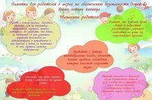 17. Не забудьте ознакомиться с рекомендациями по организации досуга ребенка в летний период, оказанию первой медицинской помощи (при укусах, отравлениях, солнечном и тепловом ударах), правилами поведения в лесу, на водоемах, на дорогах и улицах. Ежедневно напоминайте своему ребёнку о правилах дорожного движения. Используйте для этого соответствующие ситуации на улице во дворе, по дороге в детский сад. Находясь с ребенком на улице полезно объяснять ему все, что происходит на дороге с транспортом, пешеходами. Например, почему в данный момент нельзя перейти проезжую часть, какие на этот случай существуют правила для пешеходов и автомобилей, укажите на нарушителей, отметив, что они нарушают правила, рискуя попасть под движущиеся транспортные средства.