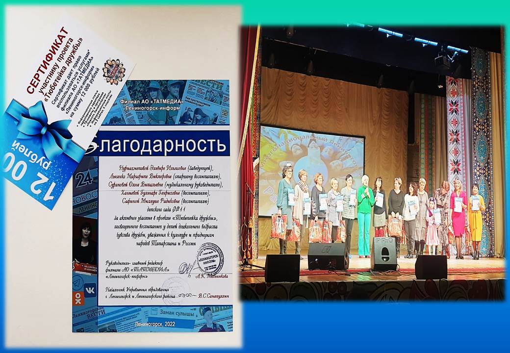Детский сад №11 принял активное участие в проекте "Тюбетейка дружбы" организованным филиалом АО "ТАТМЕДИЯ" "Лениногорск-информ". Благодарим за активное участие воспитанников подготовительной к школе группы, а также наших педагогов