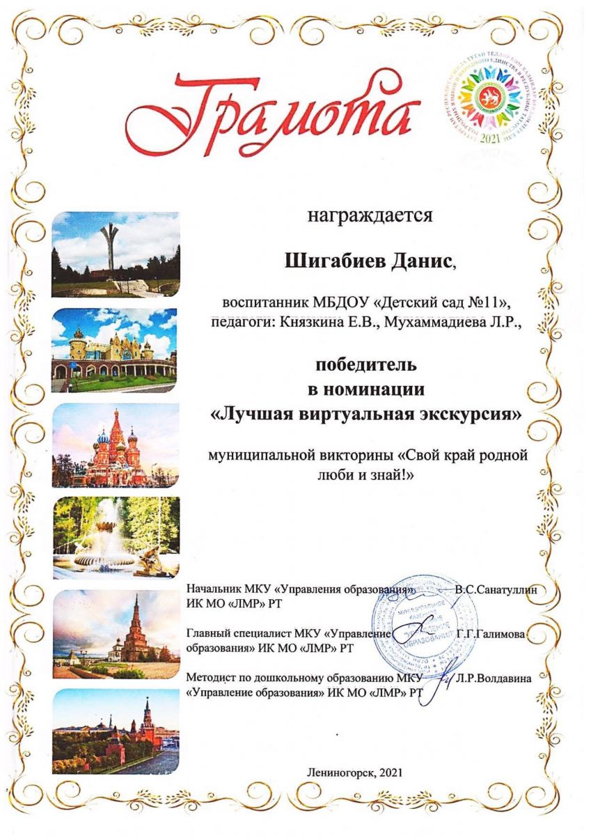 О проведении муниципальной викторины «Свой край родной люби и знай!», в целях воспитания патриотизма, сохранения и приумножения национального, культурно-исторического наследия народов, проживающих в России, 15 ноября 2021 года прошла муниципальная викторина «Свой край родной люби и знай!». В данном конкурсе приняли участие воспитанники старшего дошкольного возраста дошкольных образовательных учреждений Лениногорского муниципального района. По итогам конкурса, наш воспитанник ШИГАБИЕВ ДАНИС СТАЛ ПОБЕДИТЕЛЕМ В НОМИНАЦИИ «ЛУЧШАЯ ВИРТУАЛЬНАЯ ЭКСКУРСИЯ» под руководством воспитателей КНЯЗЬКИНОЙ Е. В., МУХАММАДИЕВОЙ Л. Р. ПОЗДРАВЛЯЕМ!