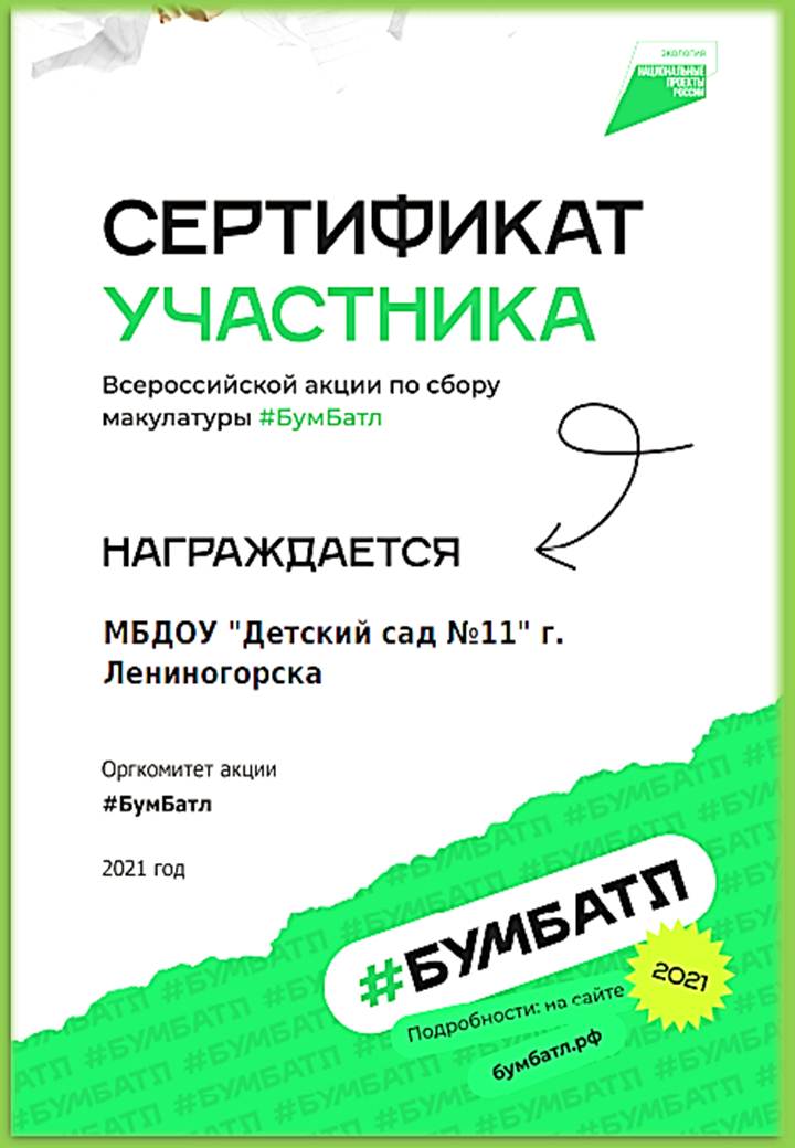 Поддерживая экологические инициативы вместе с нацпроектом «Экология», вы вносите посильный вклад в заботу об окружающей среде и являетесь примером ответственного корпоративного волонтерства. Продолжайте следовать экотрендам и вовлекать коллектив в экологические активности. Собирайте и сдавайте макулатуру на переработку на регулярной основе, давая бумажному сырью вторую жизнь. Делитесь своими результатами и сертификатом участника в соцсетях с хештегами #бумбатл #нацпроектэкология.
