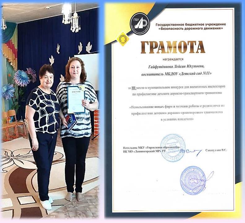 В муниципальном конкурсе для внештатных инспекторов по ПДДТТ «Использование новых форм и методов работы с родителями по профилактике детского дорожно-транспортного травматизма в условиях пандемии». Гайфутдинова Л. Ю., воспитатель заняла III место.