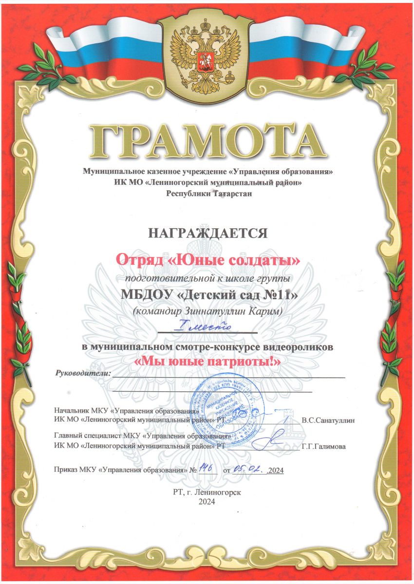Согласно плану работы МКУ «Управление образования» ИК МО «ЛМР» РТ на 2023-2024 учебный год, с целью сохранения и развития традиций гражданско-патриотического воспитания; выявления лучших команд детей старшего дошкольного возраста по строевой подготовке, был проведен муниципальный смотр-конкурс на лучший видеоролик «Мы юные патриоты!». В смотре - конкурсе приняли участие двенадцать детских садов города Лениногорска. По итогам конкурса, НАШ ДЕТСКИЙ САД ЗАНЯЛ I МЕСТО в муниципальном смотре-конкурсе (отряд «Юные солдаты» МБДОУ «Детский сад №11» (командир Зиннатуллин Карим)). УРА! ПОЗДРАВЛЯЕМ!