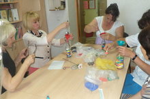 В МБДОУ был проведен мастер класс на котором инструктор по трудотерапии СРО КЦСОН "Исток - Башлангыч" Носова Н.С. учила педагогов навыком оформления различных емкостей с ипользованием цветных сыпучих материалов.