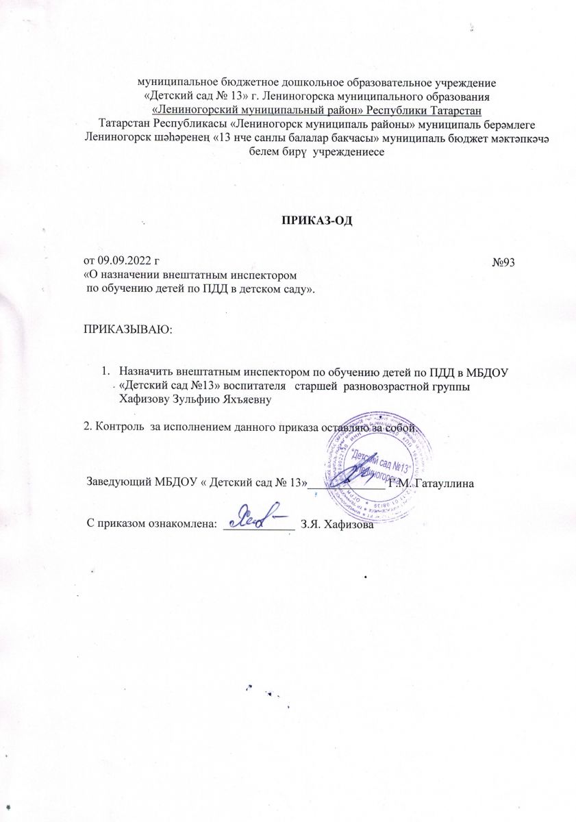 Приказ "О назначении внештатным инспектором по обучению детей по ПДД в детском саду"