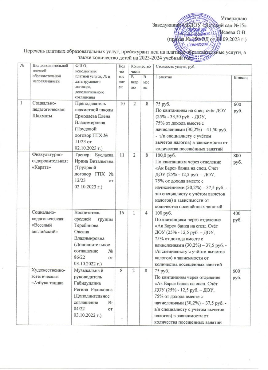 Перечень платных образовательных услуг, прейскурант цен на платные образовательные услуги на 2023-2024гг