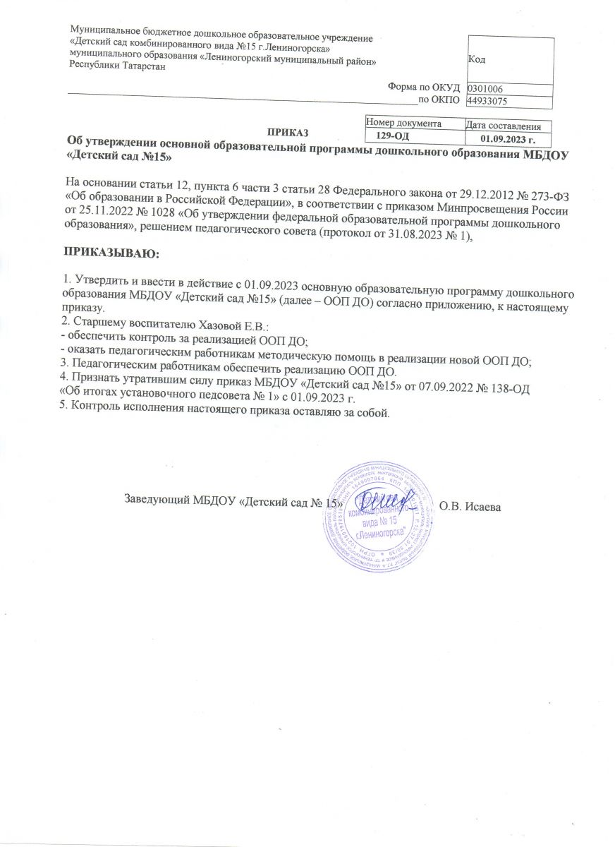 Приказ "Об утверждении ООП ДОО МБДОУ "Детский сад №15""