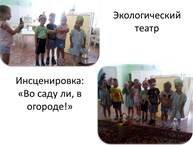 Театрализованная деятельность в детском саду имеет свои особенности и ее значение невозможно переоценить. Она позитивно влияет на всестороннее развитие дошкольников. Проведенная тематическая неделя в нашем саду "Во саду ли, в огороде" была направлена на расширение представлений детей о растениях с которыми дети встречаются в нашем регионе. В течение все недели организованны и проведены тематические беседы, дидактические игры. уделили большое внимание и труду в огороде. Данное направление способствовало формированию элементарных экологических представлений у детей. Итогом работы стало экологическое театрализованное представление детей «Во саду ли, в огороде!».