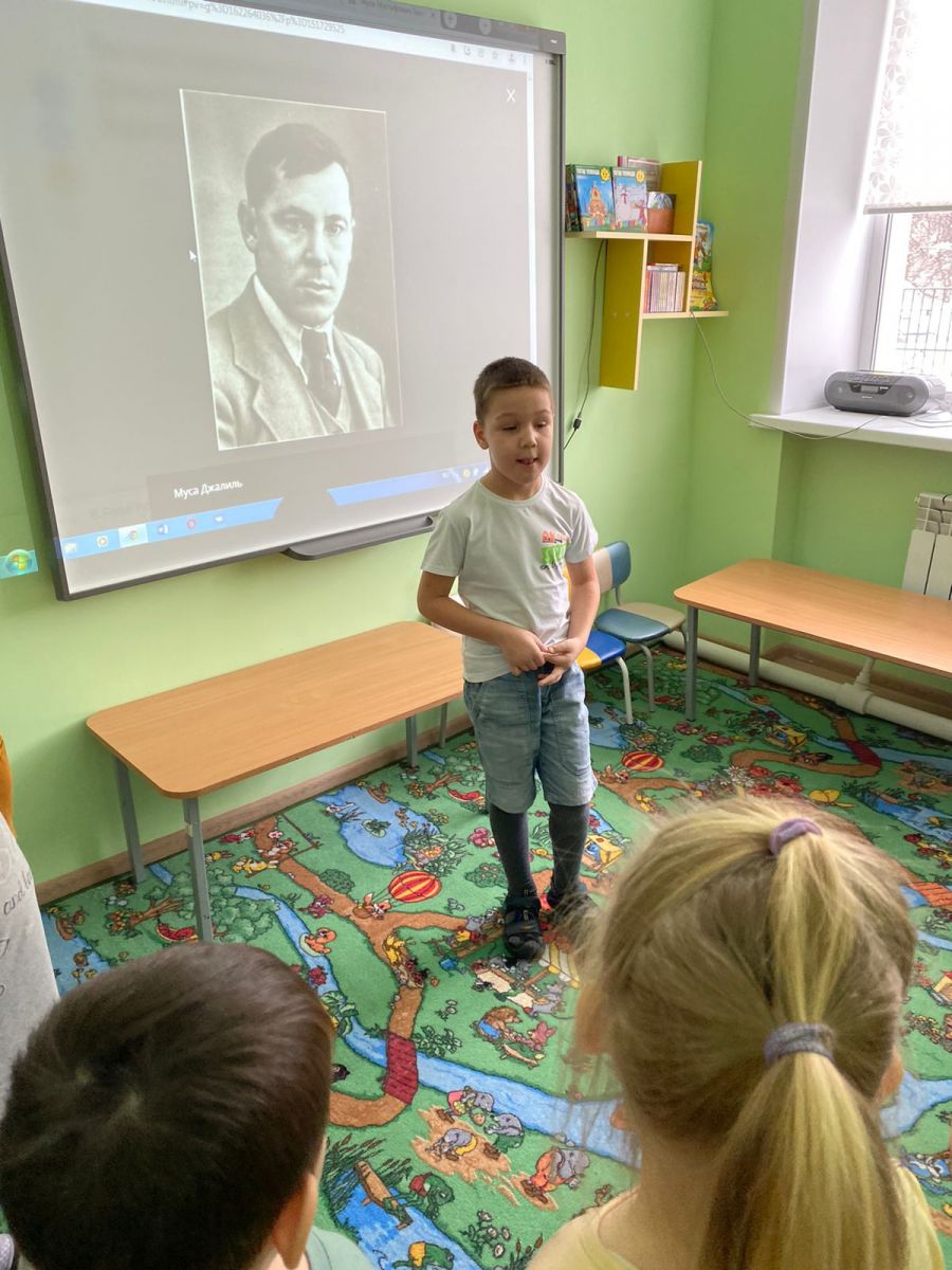 Бүген танылган татар шагыйре Муса Җәлилнең тууына 116 ел тула. "Үлгәндә, үлмәсәң-батырлык гасырларда калачак" - шундый исем астында мәктәпкә әзерлек төркемендә хәтер сәгате узды. Балалар бөек шагыйрьнең төп тормыш этапларын искә төшерделәр, аның шигырьләрен укыдылар, Бөек Ватан сугышы елларында әсир ителгән ватандашлар арасында фашистларга каршы пропаганда алып барган татар яшьтәшләренең батырлыгы турында тыңладылар.