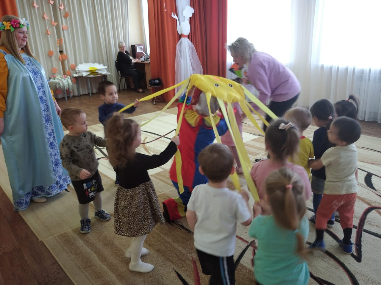 Это развлечение ежегодно проводится в нашем детском саду и стало уже традиционным и любимым для детей. Вот и в этом году дети стали участниками проводов Масленицы. Как положено на празднике, дети от души веселились: водили хоровод вокруг Масленицы, играли в игру «Гори, гори ясно», пели и плясали. В заключение они с удовольствием угощались вкусными и пышными блинами. Фото1, Фото2, Фото3, Фото4.