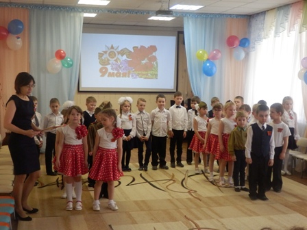 8 мая прошёл торжественный праздник, посвящённый это великой дате. Дети подготовили стихи, песни, сценки о военных годах, исполнили танец «Ах, эти тучи в голубом…», почтили память павших на войне «Минутой молчания». В завершении праздника воспитанники старшей и подготовительной группы совершили экскурсию на «Аллею славы» и возложили цветы к памятнику «Войну – освободителю».