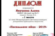 Поздравляем воспитателя подготовительной группы Надежду Александровну Носову и её воспитанницу Якушину Алину с ПОБЕДОЙ- 1 МЕСТО в муниципальном этапе Международного конкурса «Пасхальное яйцо 2019». Желаем Надежде Александровне счастья, благополучия и дальнейших творческих успехов в работе!