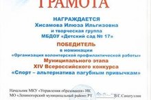 Поздравляем Хисамову Илюзу Ильгизовну, старшего воспитателя и творческую группу детского сада с победой в номинации «Организация волонтерской профилактической работы» муниципального этапа XIV Всероссийского конкурса «Спорт – альтернатива пагубным привычкам».