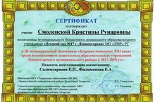 21 ноября на базе МБДОУ «Детский сад №2» состоялся первый этап III Муниципальной Олимпиады для дошкольников «Здоровое поколение ХХI века». С достойным результатом на данной Олимпиаде выступила Кристина C., воспитанница подготовительной к школе группы. Желаем Кристине прекрасного здоровья, веселых друзей, интересных увлечений и больших побед!