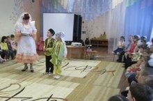Утренник прошёл в виде популярной игры "Поле чудес", в которой были задействованы не только дети, но и родители, и герои "Лиса Патрикеевна" и