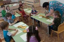 Низамова С.Г., воспитатель средней группы, пригласила в гости на занятие Пчелку. Она рассказала воспитанникам о своей жизнедеятельности, «продемонстрировала» свой внешний вид и перенесла ребят в среду своего обитания, где наглядно показала соты и мед. Педагог предложила ребятам изготовить из яйца от киндер-сюрприза красивую пчелку и подарить их гостье.