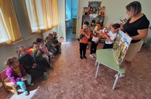 Сегодня ребята 1 младшей группы получили письмо от Старичка-Лесовичка, в котором он пригласил детей к себе в лес. Малыши совместно с Коршиной Ю.Ю., музыкальным руководителем, с радостью отправились в путешествие. По дороге они весело играли, танцевали, пели песни, выполняя задания Лесовичка. Встретившись с лисой, волком и петушком, научили их играть в подвижные игры и развивать ловкость, быстроту реакции. В завершении Лесовичок угостил всех ребят соком. Все получили заряд энергии и бодрости от прошедшего развлечения. // Бүген 1 кече төркем егетләре Иске Лесовичтан хат алды, анда ул балаларны урманга чакырды. Балалар, музыка җитәкчесе Коршина Ю.Ю.белән бергәләп, шатланып сәяхәткә киттеләр. Юлда алар Лесовичка кушканнарны үтәп, күңелле уйнадылар, биеделәр, җырлар җырладылар. Төлке, бүре һәм әтәч белән очрашкач, аларны хәрәкәтчән уеннар уйнарга һәм җитезлекне үстерергә, реакция тизлеген үстерергә өйрәттеләр. Ахырда Лесовичок барлык балаларны сок белән сыйлады. Барысы да энергия һәм күңел ачу зарядын алды.