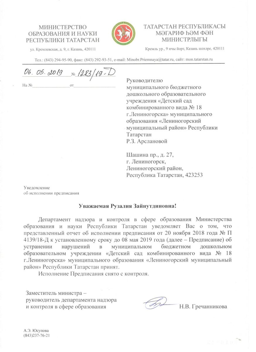 Отчет по исполнению предписания департамента надзора и контроля в сфере образования РТ