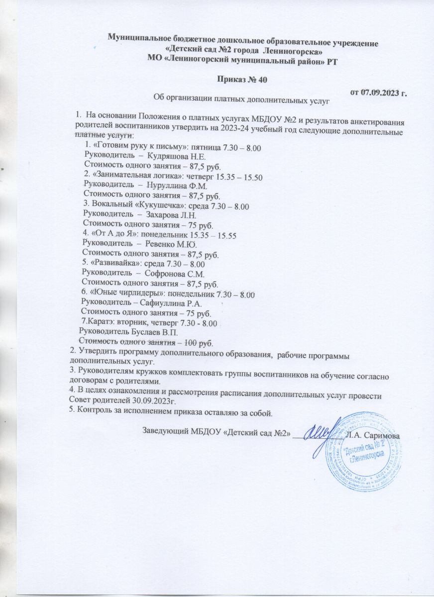 Приказ об утверждении платных образовательных услуг на 2023- 2024 год.