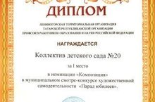 Балалар бакчасы коллективы”Юбилейлар парады”дип исемләнгән үзешчән сәнгать муниципаль бәйгесендә “Композиция” номинациясендә беренче урынны яулап, диплом белән бүләкләнде.